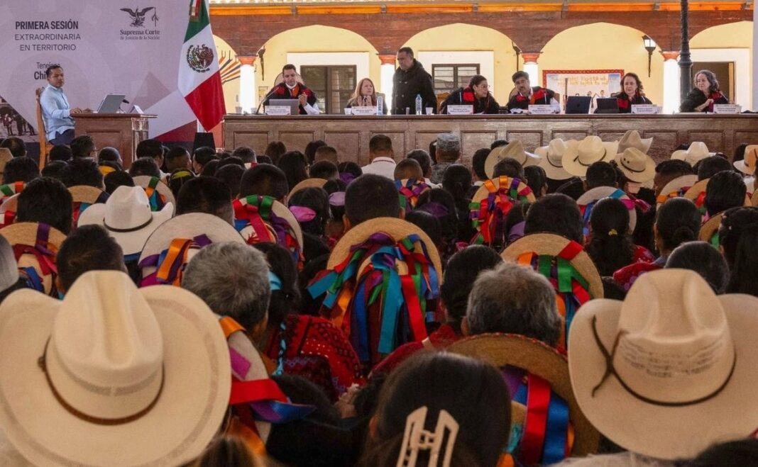En una sesión histórica realizada en la plaza principal de Tenejapa —la primera itinerante de la Corte en un pueblo indígena—, seis ministros acudieron de forma presencial y dos participaron a distancia, ante alrededor de dos mil integrantes de los pueblos tsotsil y tseltal. Por unanimidad de ocho votos, el pleno aprobó el proyecto de la ministra Loretta Ortiz Ahlf, que resolvió el amparo en revisión 344/2025.