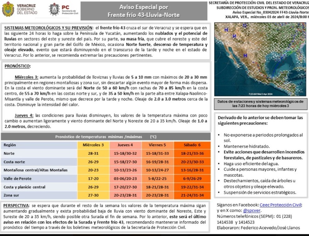 Autoridades de Veracruz exhortaron a los ciudadanos a tomar precauciones debido al Frente Frío Norte, el cual podría generar vientos dominantes de 50 a 60 kilómetros por hora, provocando destechamientos, caídas de árboles y otros objetos.